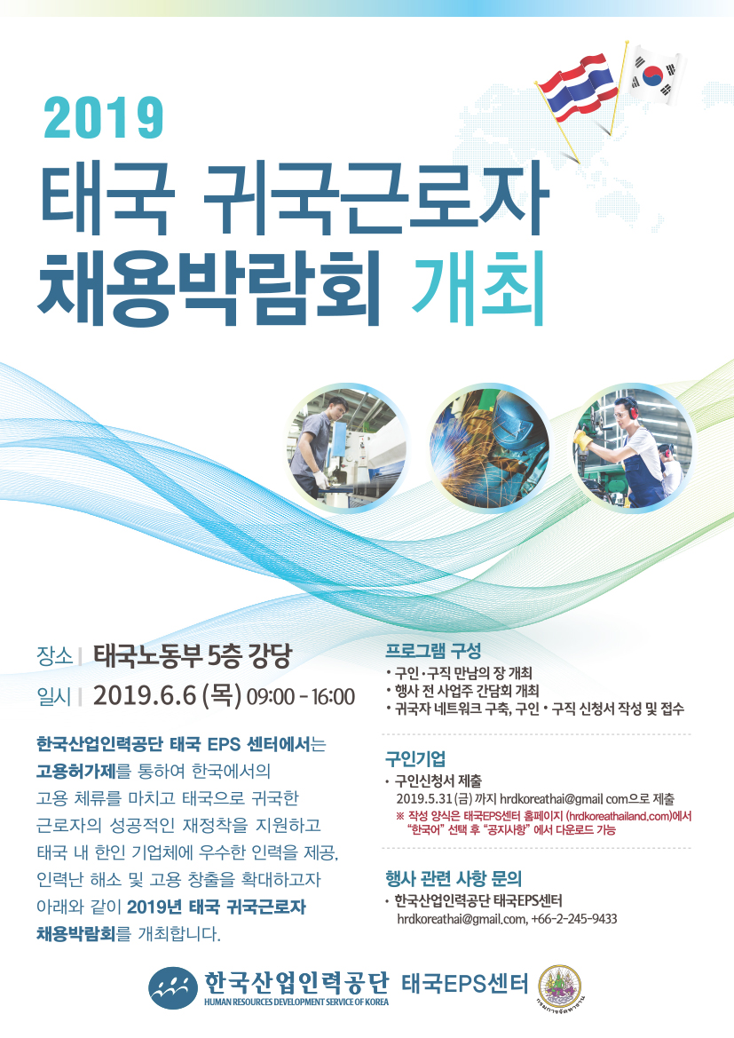 한국산업인력공단 태국EPS센터에서는 태국노동부 고용국과 공동 주관으로 『고용허가제(EPS) 태국 귀국근로자 채용박람회 2019』 행사를 개최합니다.