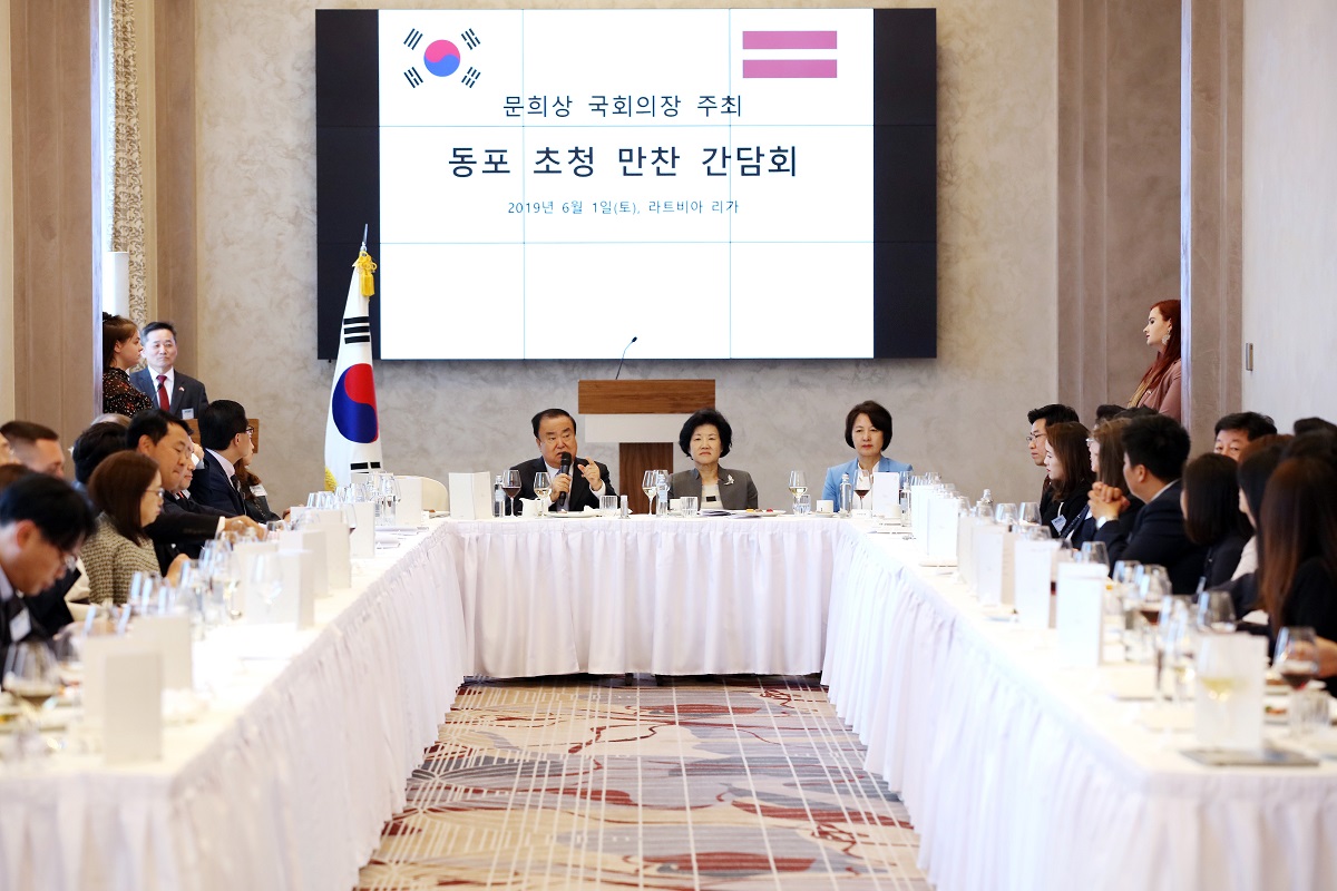 라트비아를 공식 방문 중인 문희상 국회의장은 현지시간 6월 1일 라트비아 리가에 위치한 그랜드호텔 캠핀스키에서 동포 초청 만찬간담회를 가졌다.