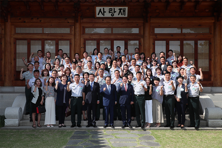 문 의장은 또 “오늘 함께 해주신 배우자 여러분도 많은 것을 포기하고 양보하고, 인내해야 하는 군인가족의 삶을 살아오셨다. 지금 옆에 계신 배우자를 모범용사로 만들 정도로 훌륭하게 잘 견뎌오셨다”면서 “우리 국방을 튼튼하게 만든 최고의 조력자가 아닐 수 없다”며 국군모범용사 배우자들의 노고를 격려했다.