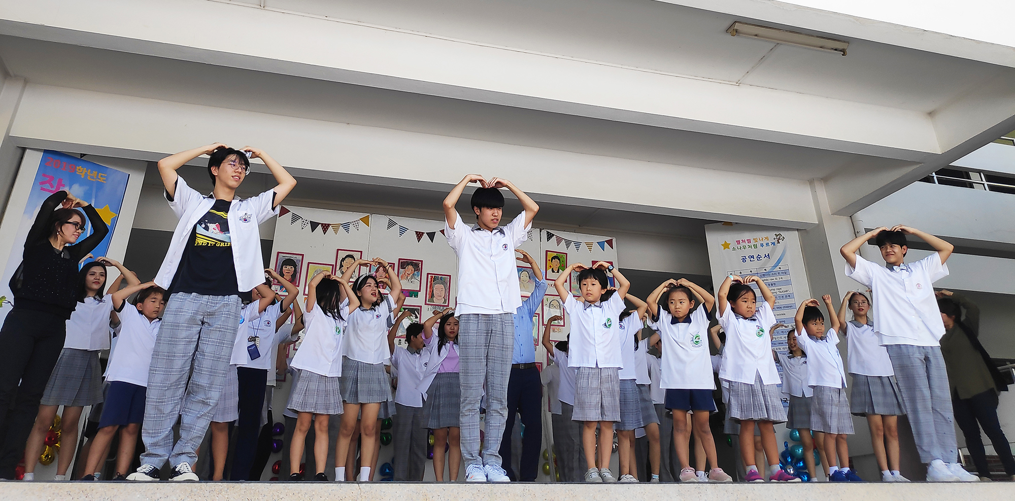 본관 복도에서는 중등 미술 수업시간에 만들었던 팝아트와 정크 아트 작품들이 전시되었고, 공연 무대 배경은 초등 어린이들의 개성 넘치는 자화상으로 가득 채워졌다.