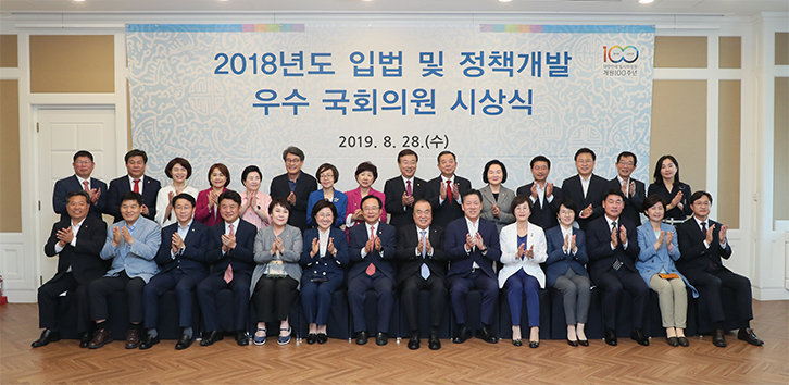 문희상 국회의장은 28일 ‘2018년도 입법 및 정책개발 우수 국회의원’시상식을 갖고 최우수 국회의원 6명과 우수 국회의원 36명에게 각각 상패를 수여했다.