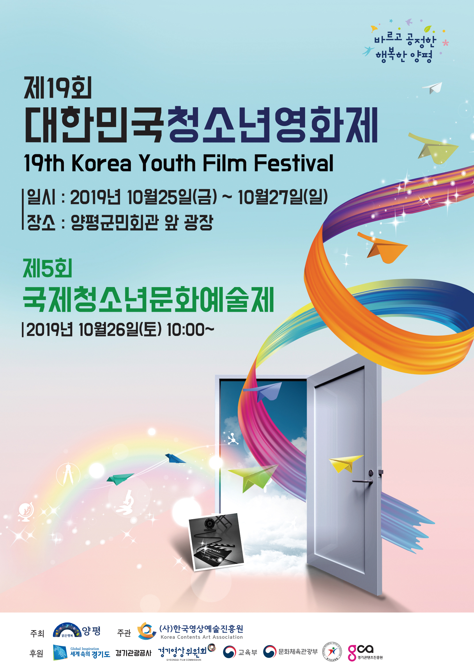 “청춘, 이상(理想)을 품다”란 슬로건아래 개최하는 제19회 대한민국청소년영화제는 경기도 양평군(군수 정동균)이 주최하고, 사단법인 한국청소년영상예술진흥원(원장 성낙원)이 주관하며 문화체육관광부, 교육부, 경기도, 경기도교육청 후원으로 개최한다. 미래 한국영화인을 발굴하고 양성하여, 한국영상산업을 이끌어갈 인재를 육성하기 위해 개최하는 경쟁영화제다.