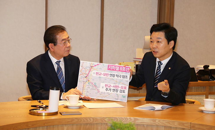 김병관 국회의원은 21일 박원순 서울시장 면담을 통해 경기도 도시철도망 구축계획에 반영된 지하철 8호선 판교역~모란역 연장추진 사업이 신속히 추진될 수 있도록 요청했다.