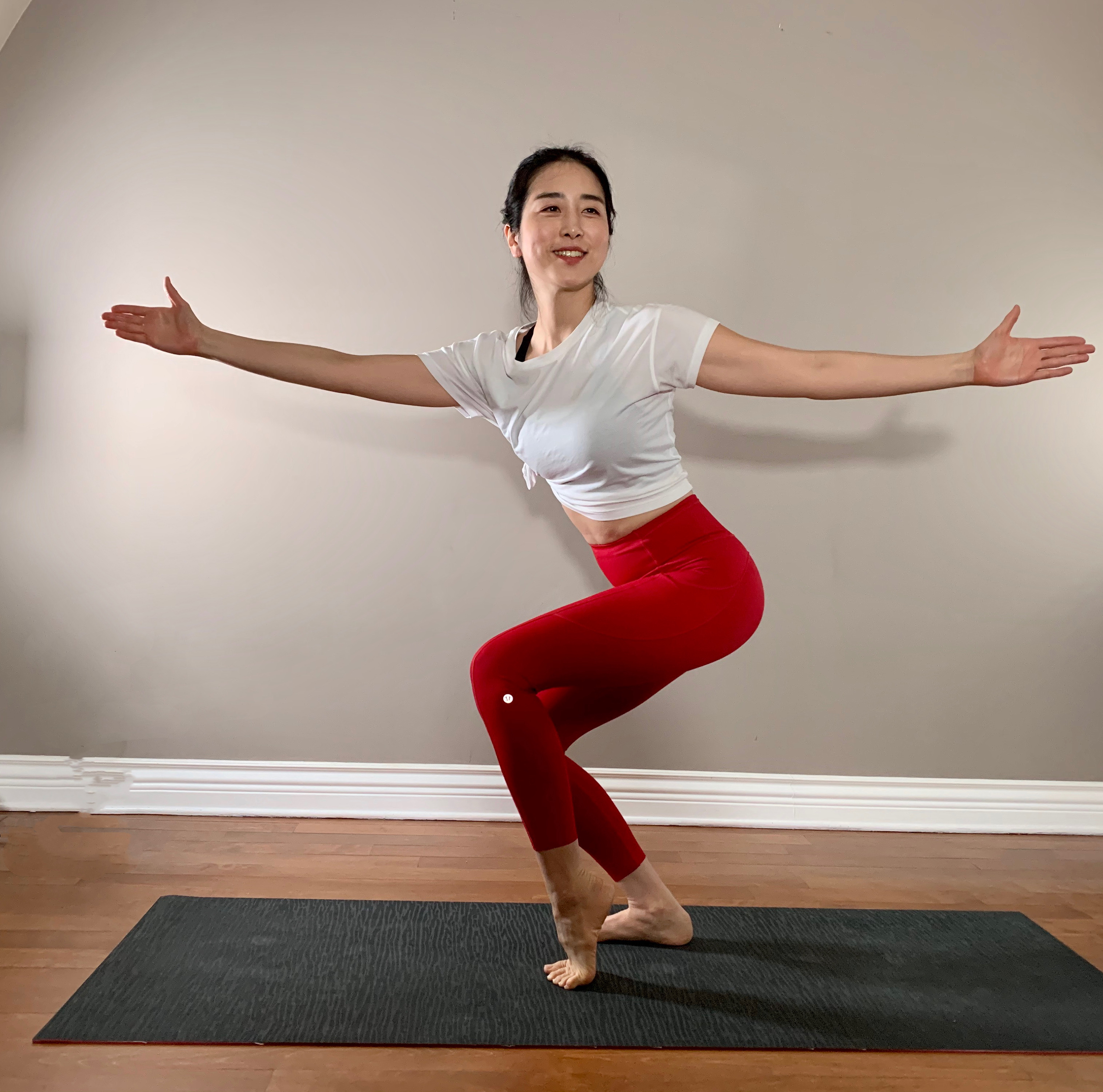 1. 오른 무릎을 구부린 상태에서 왼 다리를 펴고 두 팔을 활짝 펴서 전사 2자세를 만들어줍니다.