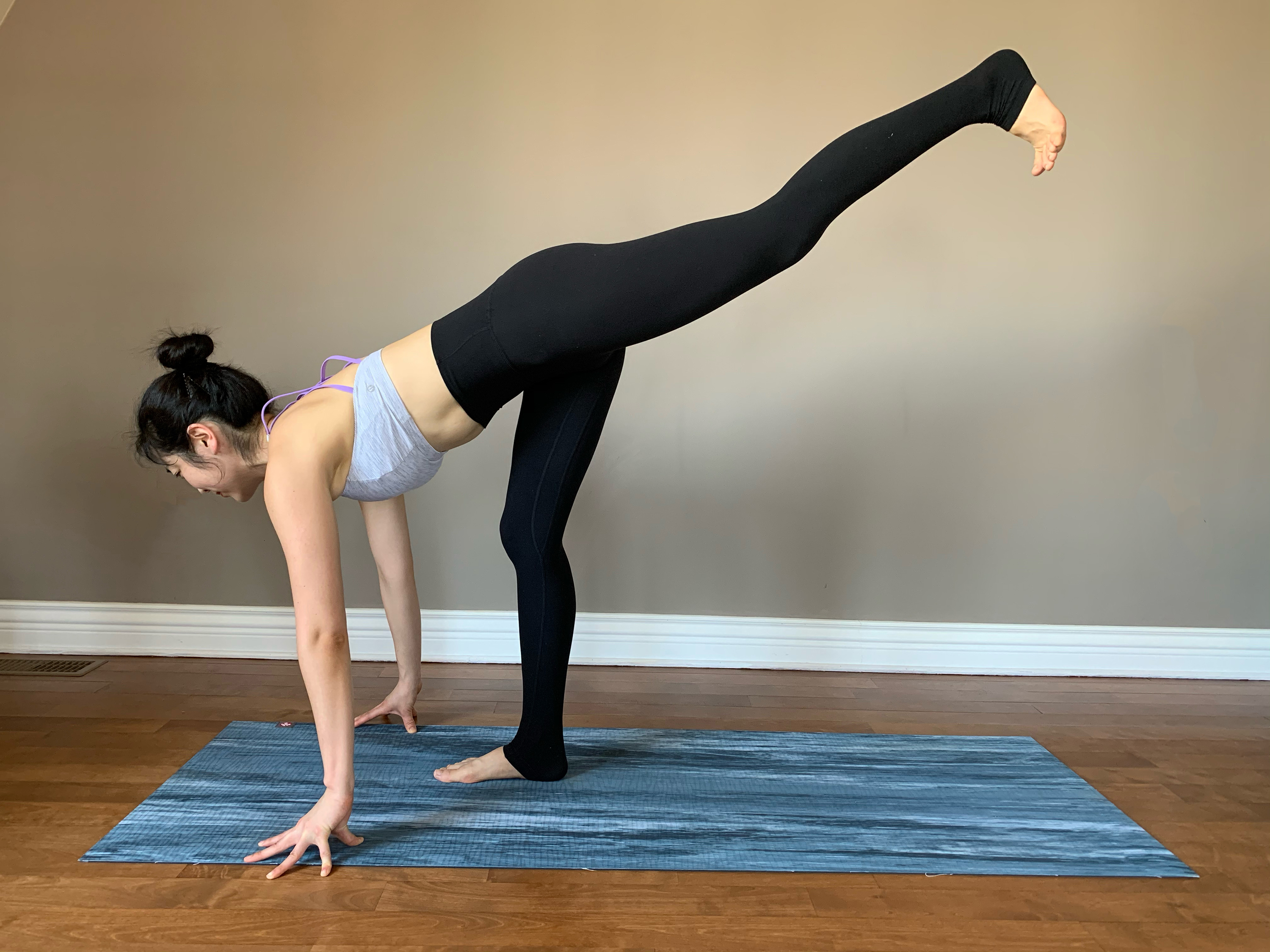 2. 코어의 힘으로 균형을 잡고 천천히 뒤의 다리를 천정쪽으로 올려줍니다. 이때 앞 무릎은 살짝 구부려주셔도 좋습니다.