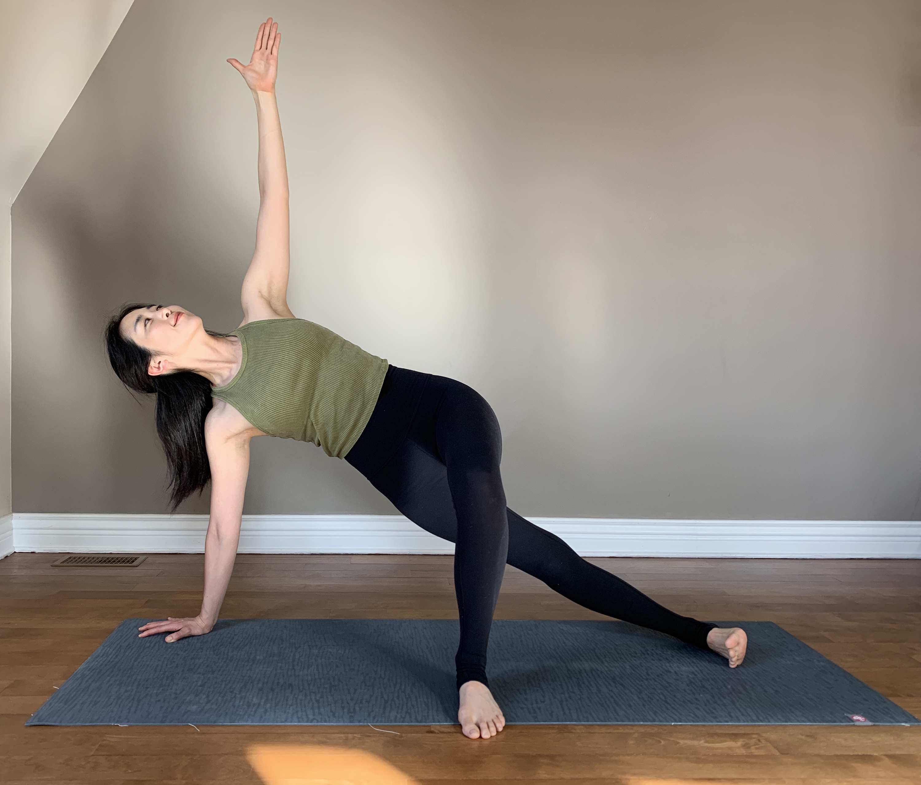플랭크 자세에서 천천히 몸통을 오른쪽으로 회전한 후, 왼팔을 하늘 위로 뻗습니다.