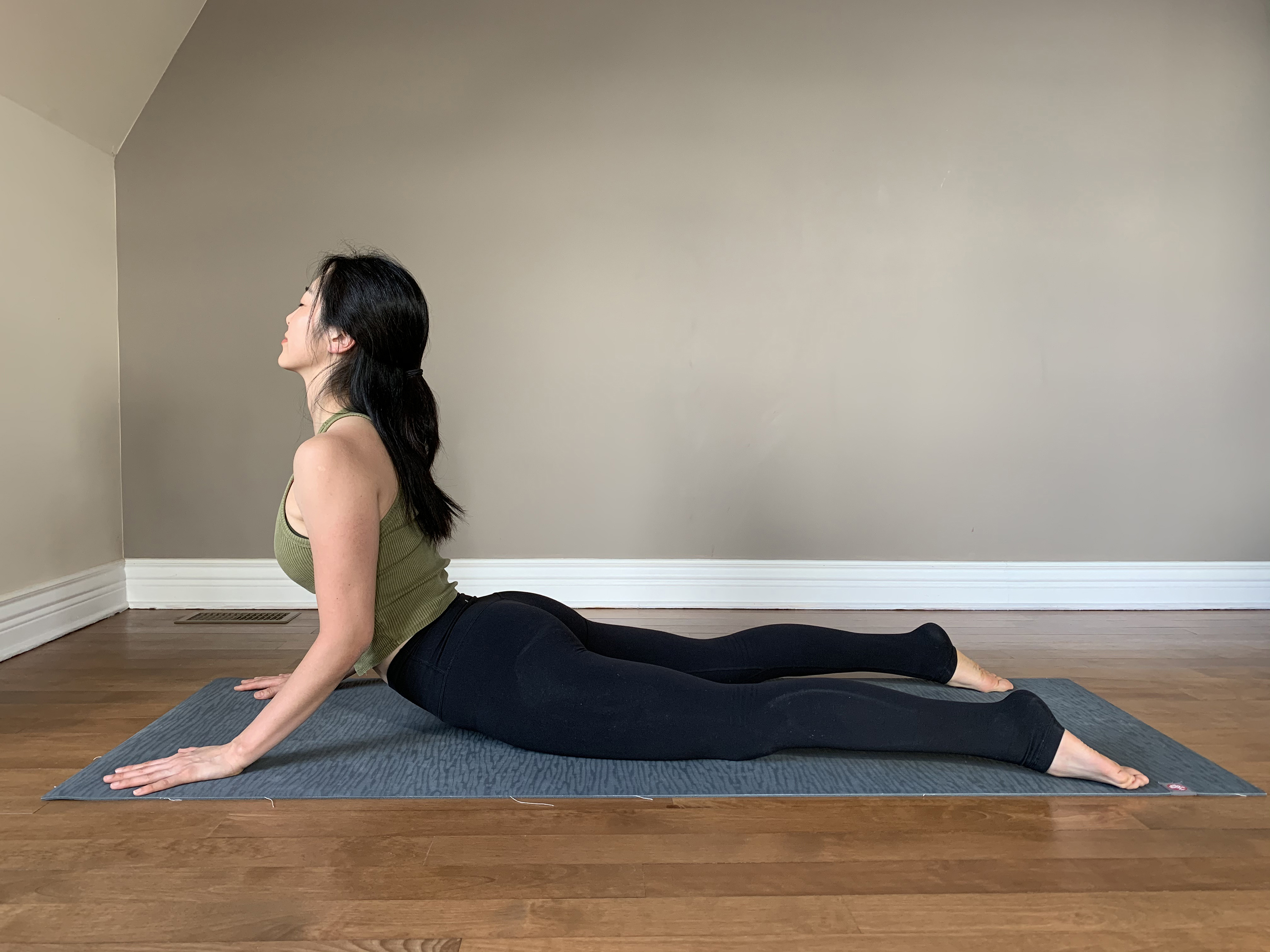 어깨를 최대한 귀에서 멀게 끌어내리고, 가슴에 창문이 있다고 상상하시며 열어주세요. 단 허리 통증이 있으신 분들은 가슴을 살짝 바닥에서 띄는 연습부터 해주세요.