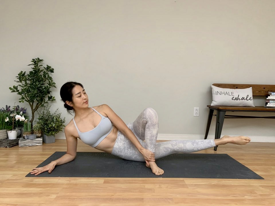 옆으로 누운 상태에서 위에 있는 다리를 앞으로 보내 무릎을 구부려 발을 바닥에 닿아줍니다. 만약 발바닥 전체가 다 닿지 않을 경우, 발꿈치를 살짝 든 상태에서 실시해도 좋습니다.