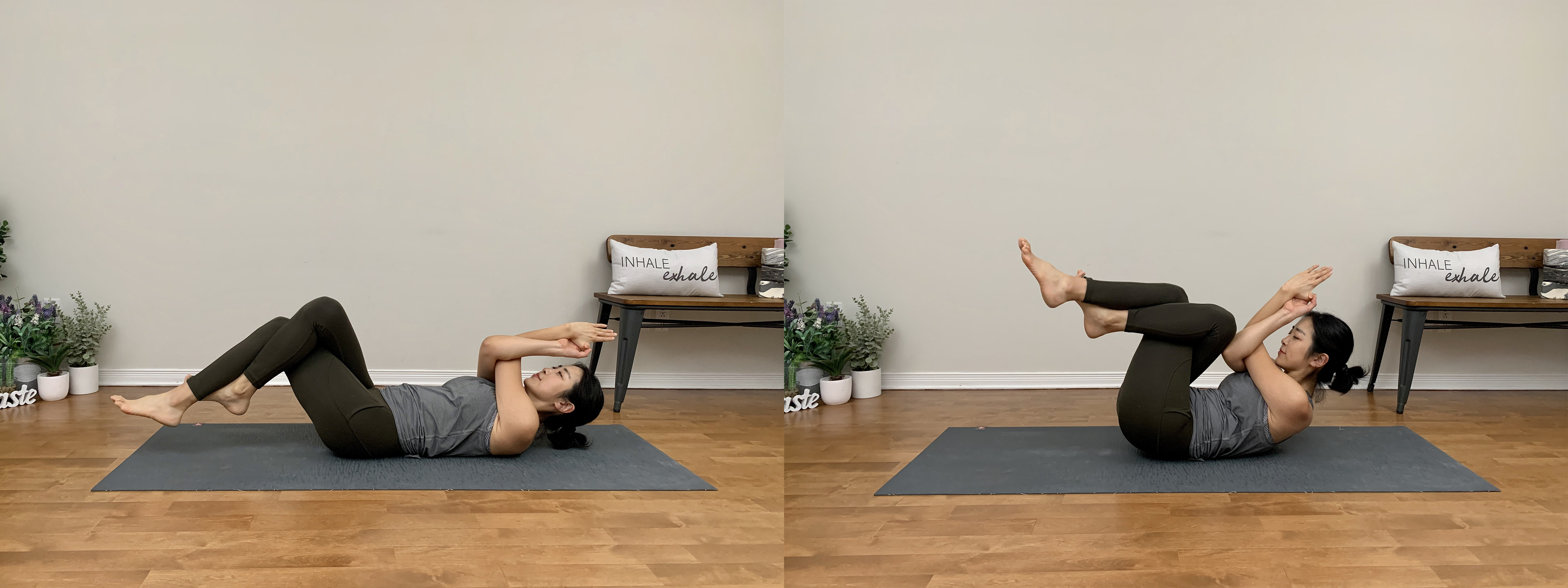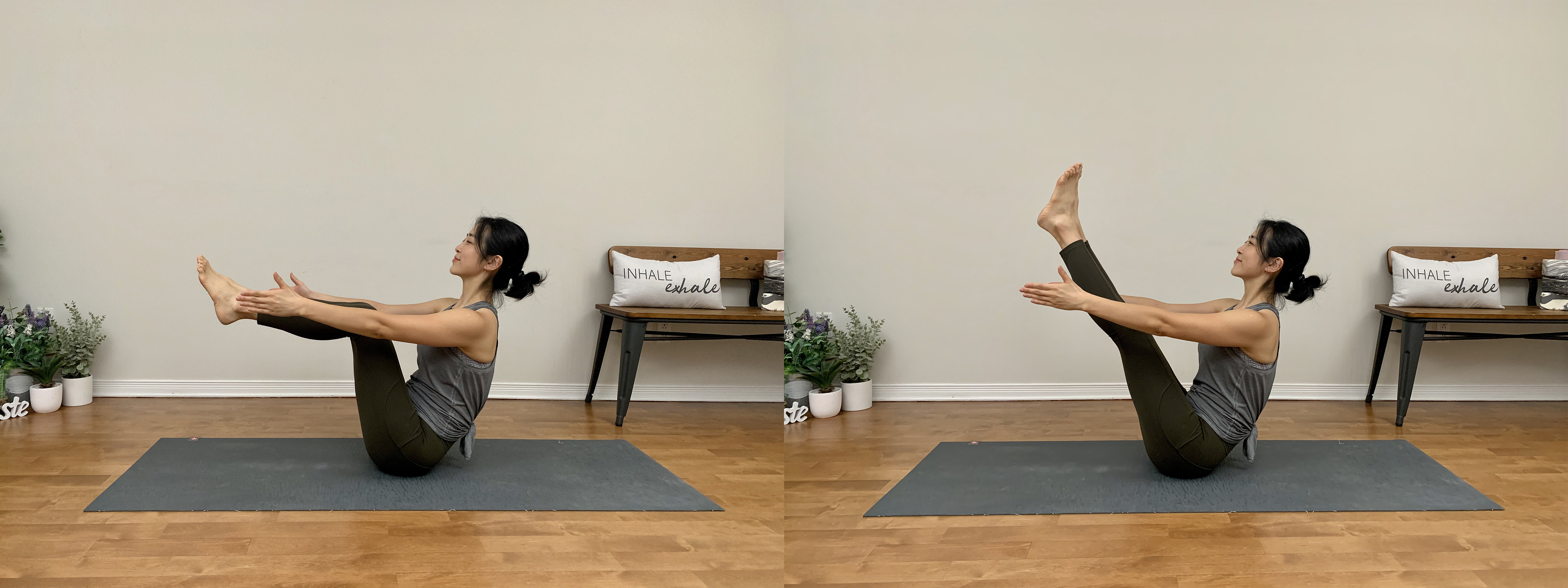 앉은 자세에서 천천히 한 다리씩 바닥에서 떼어 줍니다. 이때 두 엉덩뼈을 바닥으로 지지하면서 중심을 잡아주세요.
