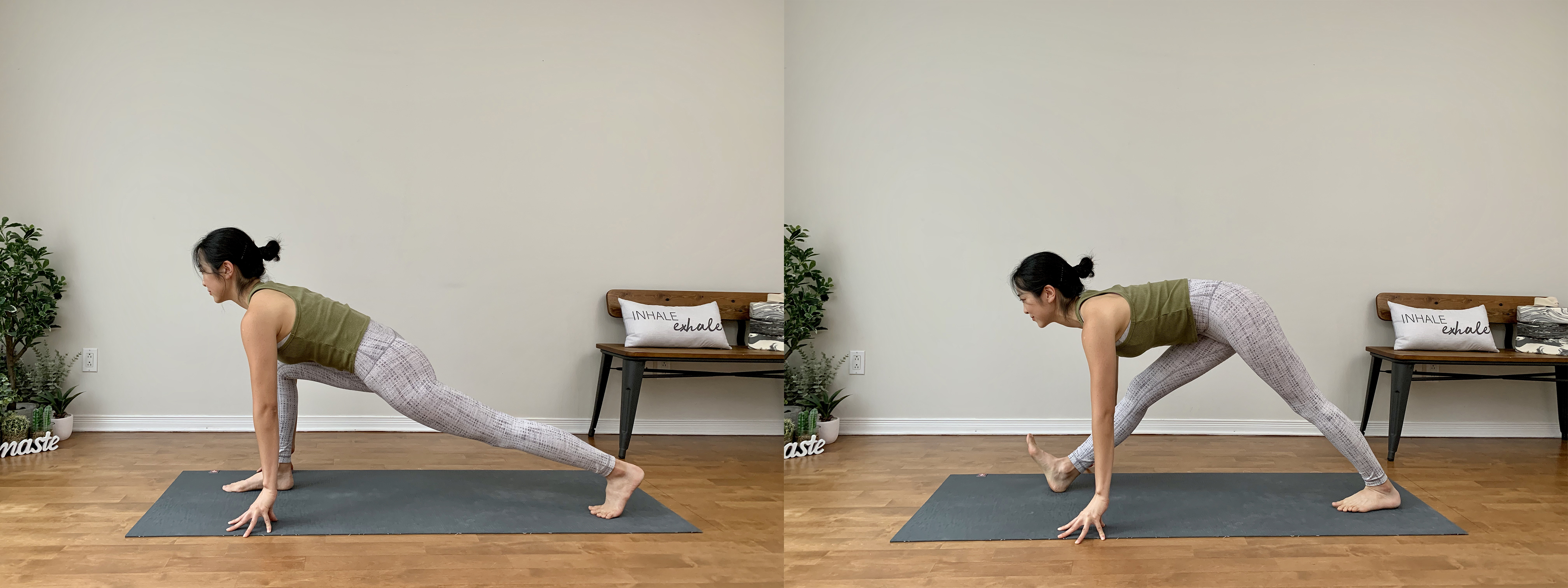 견상자세에서 오른발을 앞으로 보내 무릎을 구부려줍니다. 뒤 다리는 편 상태를 유지해주세요.