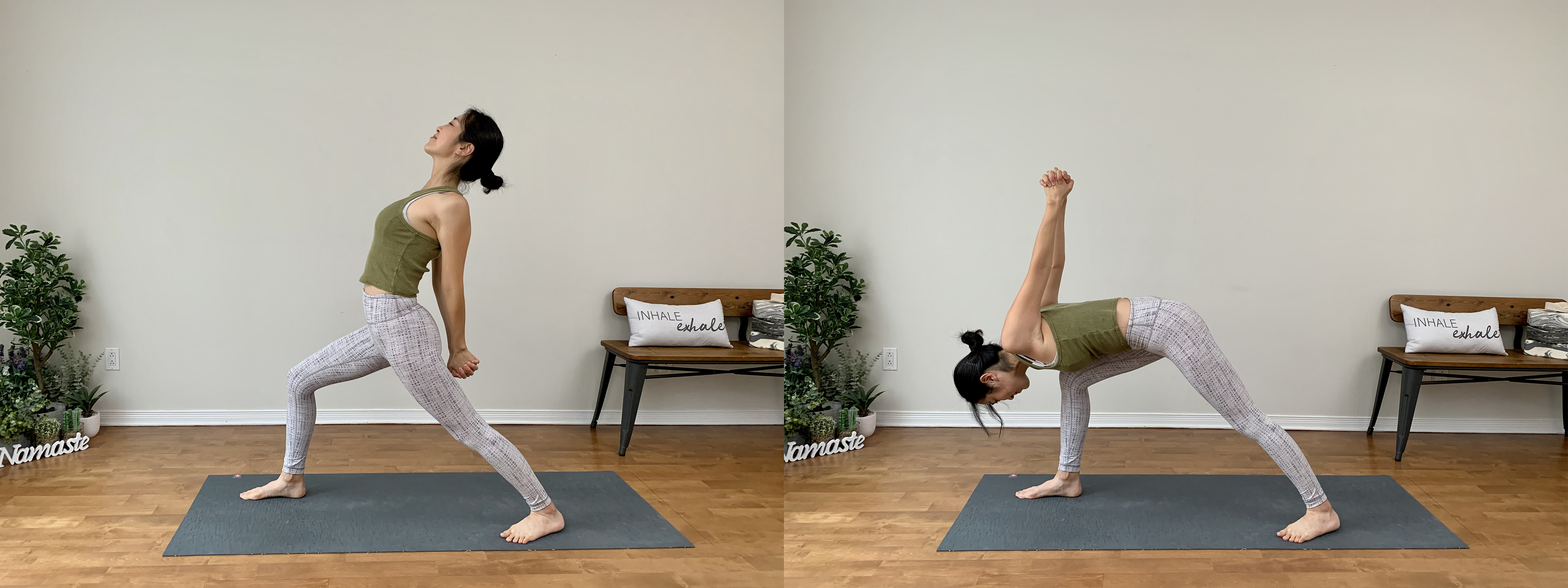 견상자세에서 오른 다리를 앞으로 가져가 런지자세를 취해줍니다. 오른 무릎은 사진과 같이 구부리고 뒤에 있는 다리는 펴주세요.