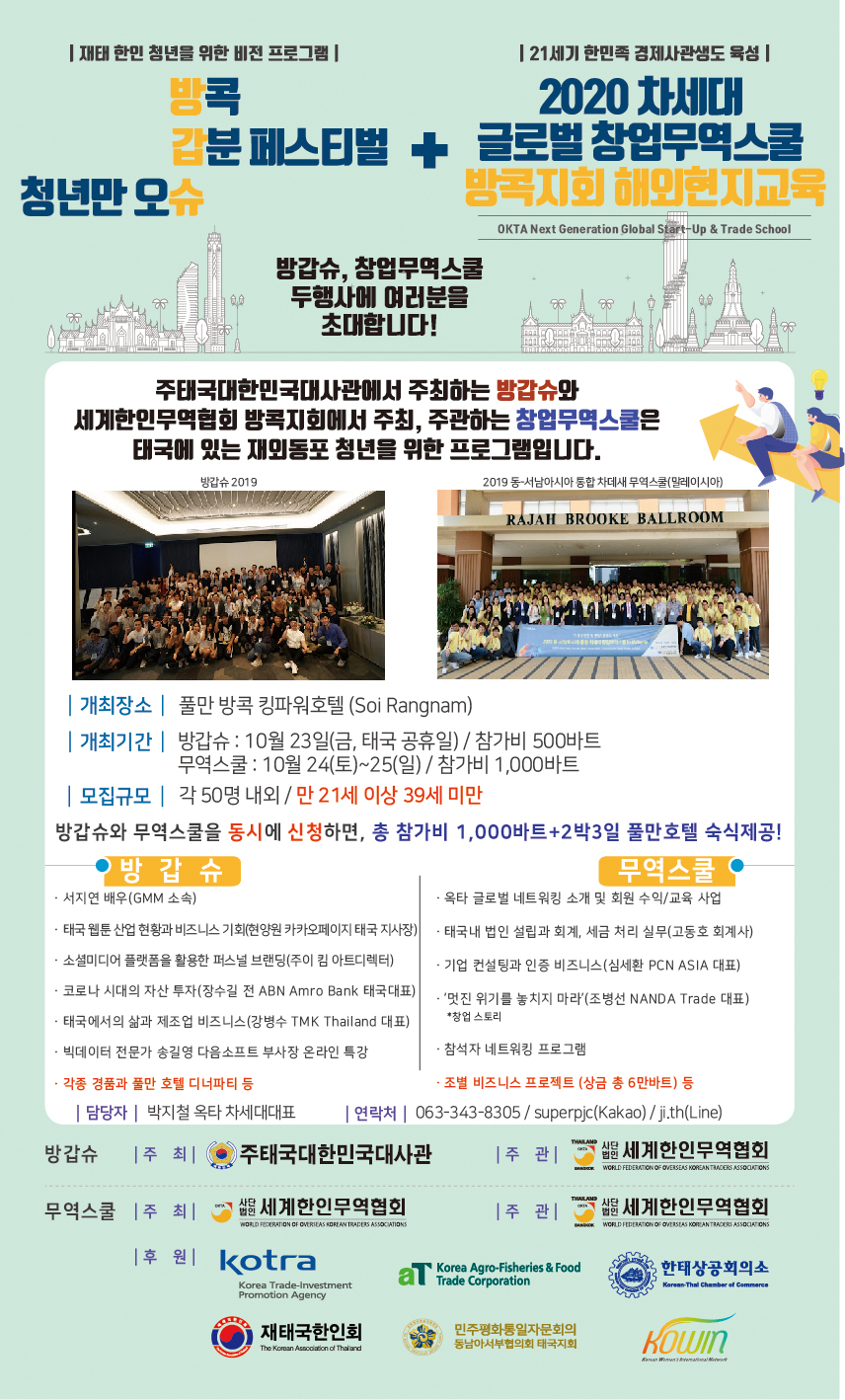세계한인무역협회 방콕지회에서 주최, 주관하는 2020 차세대 글로벌 창업무역스쿨이 개최됩니다.