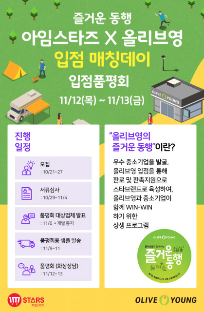 ‘아임스타즈&올리브영 입점 매칭데이’는 코로나19 확산 예방을 위해 11월 12일부터 13일까지 기존 오프라인 진행에서 온라인 화상 상담 방식으로 진행될 예정이다.