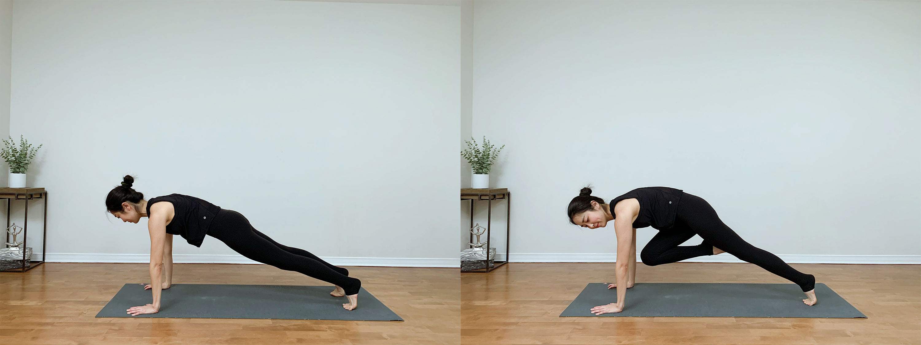 플랭크로 다시 돌아와 이번엔 복부의 힘을 이용해 왼무릎을 가슴쪽으로 당겨주세요. 이때 손바닥으로 바닥을 더 강하게 밀어주시고 배는 더 등쪽으로 수축해주세요.