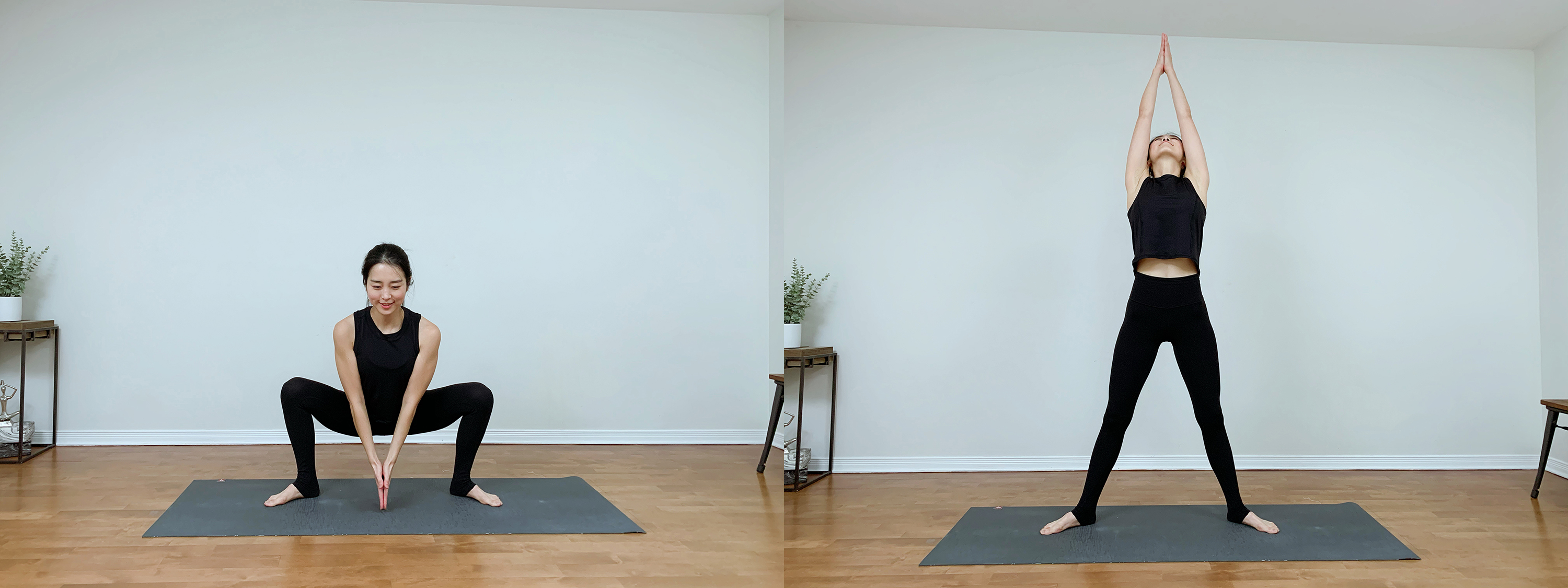 두발을 벌려 와이드스쿼트 자세에서 상체를 숙이고 손을 뻗어 바닥을 터치해줍니다. 닿지 않아도 좋으니 사진처럼 팔을 바닥을 향해 뻗어주세요.