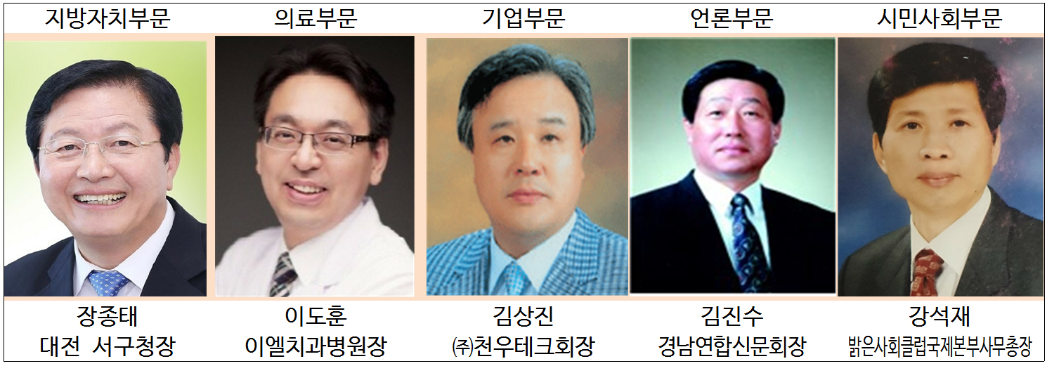 시민인권상심사위원회(위원장 김갑중 대전명예시장)는 심사를 통해 ▲지방자치부문에 장종태 대전서구청장 ▲의료부문에 이도훈 이엘치과병원장 ▲기업부문에 김상진 ㈜천우테크회장 ▲언론부문에 김진수 경남연합신문회장 ▲시민사회부문에 강석재 밝은사회클럽 국제본부 사무총장을 각각 부문별 수상자로 선정했다고 7일 발표했다.