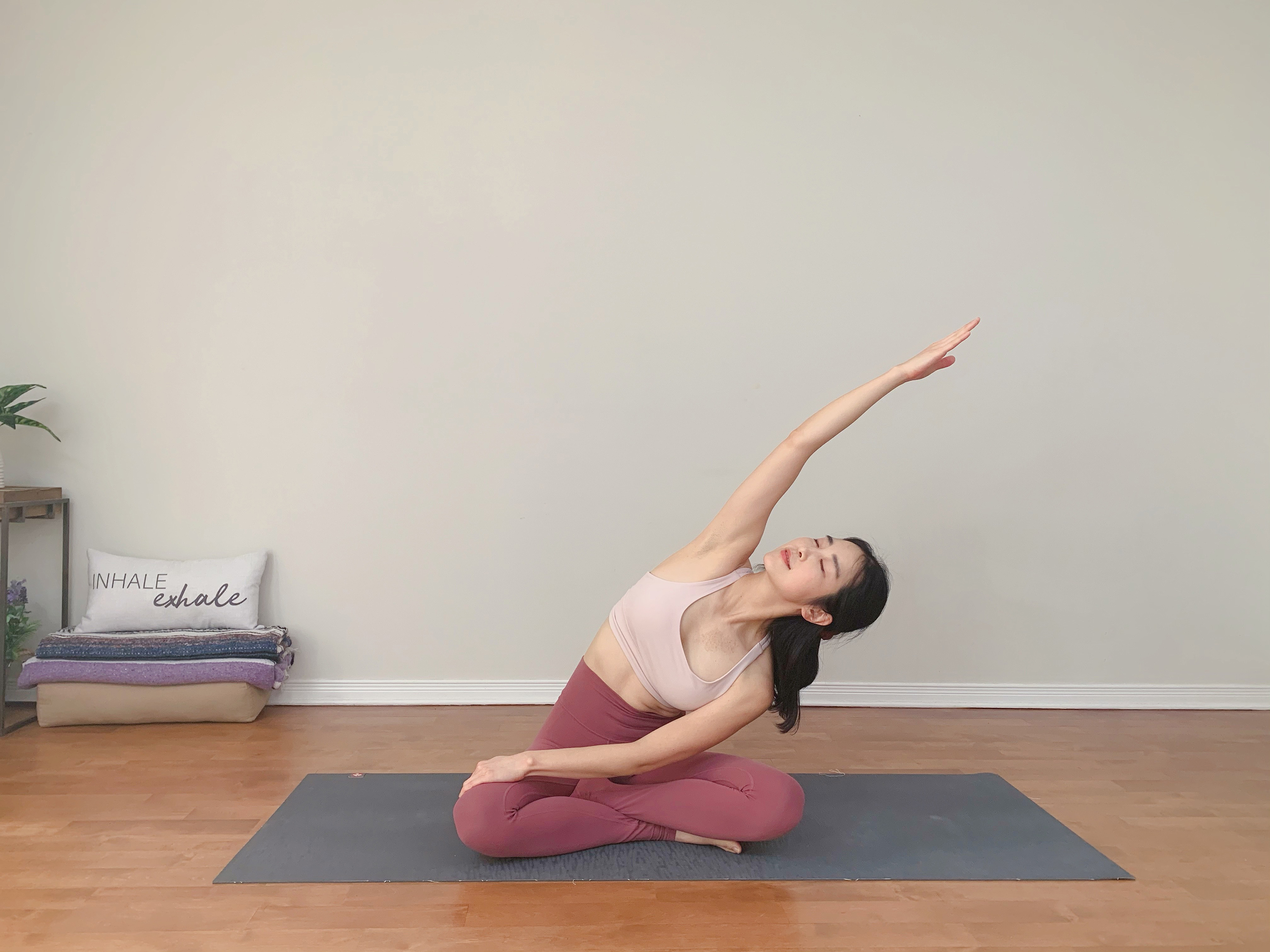 STEP 4. 이번엔 오른손은 올리고 왼손을 허벅지나 무릎위에 올려 좀더 깊게 옆면을 늘려주세요. (두번째 사진 참조)