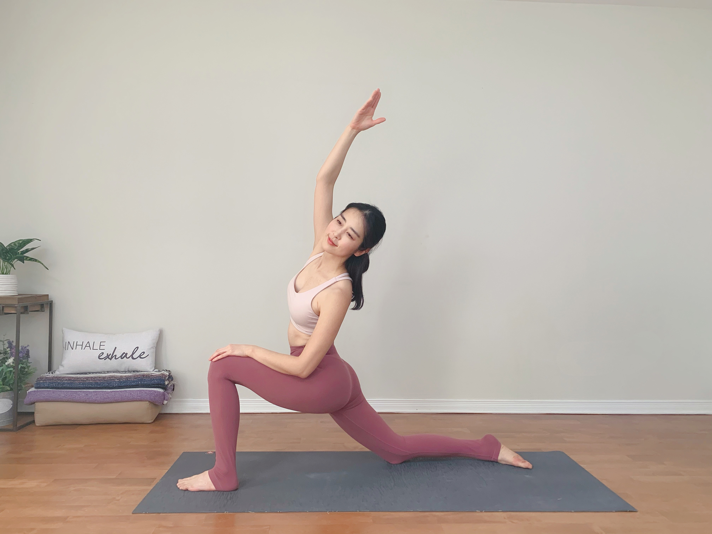 두번째 자세는 Crescent Lunge+ Side Bend입니다.