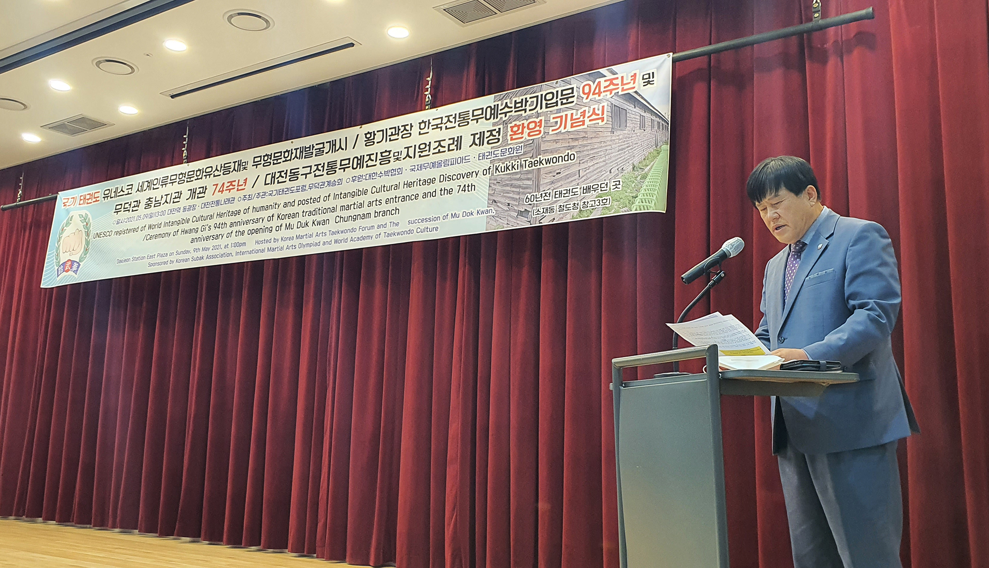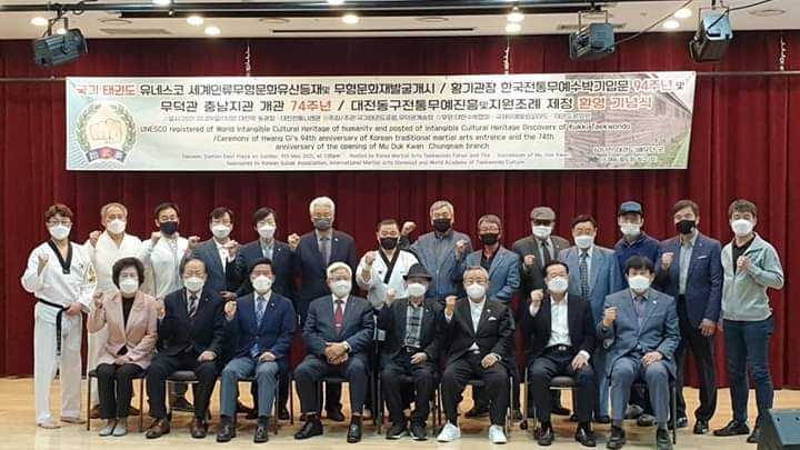 국기 태권도 유네스코 세계인류무형문화유산등재 및 무형문화재발굴개시. 황기관장 한국전통무예수박기입문 94주년 및 무덕관 충남지관 개관 74주년. 대전동구전통무예진흥 및 지원조례제정 환영기념식이 대전전통나래관 5층 대강당에서 지난 5월 9일 오후 1시에 정부 코로나19 방역 지침을 적용하여 엄중하게 개최됐다.