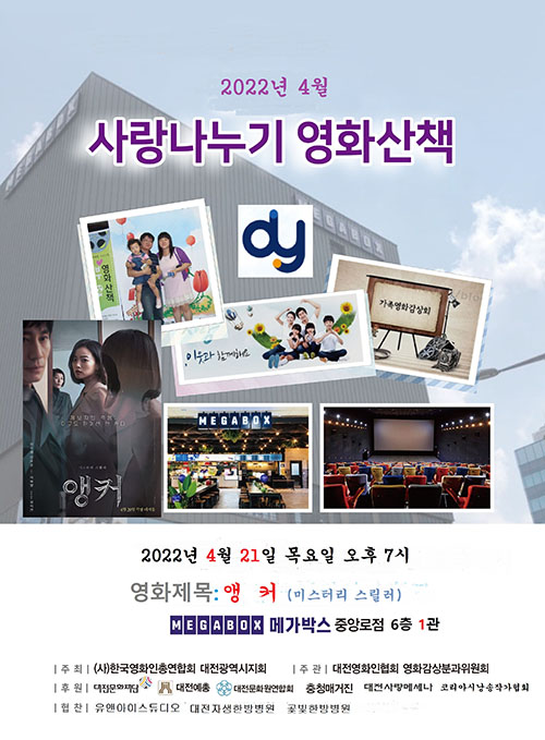 (사)한국영화인총연합회 대전광역시지회(회장 성낙원)는 4월 21일 목요일 오후7시 메가박스 대전중앙로점에서 다문화 가족, 장애인, 문화예술인 등 120여명을 초청하여 무료로 2022년 4월 사랑나누기 영화산책 행사를 개최한다.