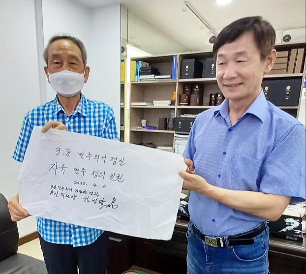 김용재 회장과 김영광 추진위원장은 각각 3.8시민운동본부 출범을 축하하는 친필 구호를 오노균 본부장과 이치현 운영위원장에게 전달하고, 시민운동본부에서는 두 원로의 건강을 염원하는 건강식품 ‘목청’을 선물했다.