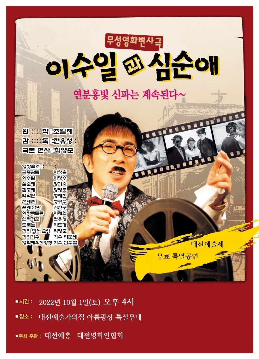 (사)한국영화인총연합회 대전광역시지회(회장 성낙원)는 2022 대전예술제 행사로 무성영화 변사극 ”이수일과 심순애“를 10월 1일(토) 오후 4시 대전예술가의집 1층 아름광장 특설무대에서 시민을 위해 무료상영을 한다.