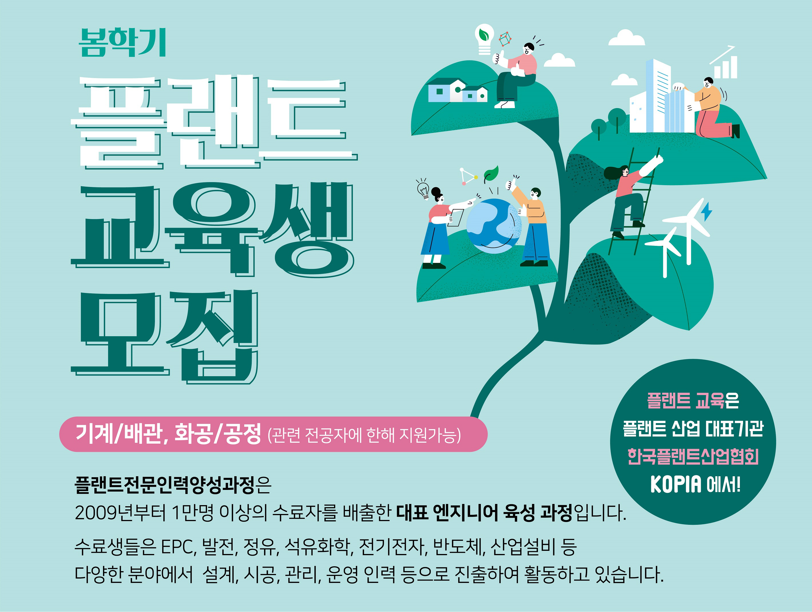 한국플랜트산업협회(KOPIA)가 ‘플랜트 전문 인력 양성 과정’ 봄학기(53기) 교육생을 모집한다. 이 과정은 산업통상자원부·고용노동부가 주관하고, 한국플랜트산업협회가 진행하는 국비 지원 취업 교육으로 교재 무상 제공 및 추가 발생 비용이 없다.