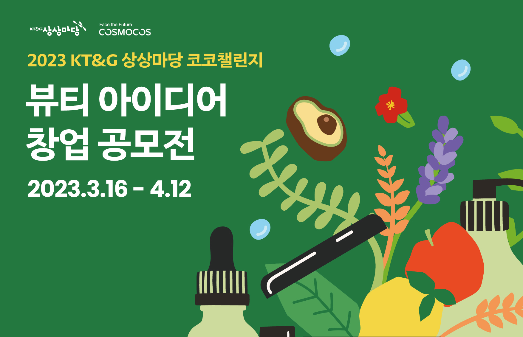 KT&G(사장 백복인)가 친환경 뷰티 분야의 창업지원을 강화하기 위해 ‘2023 KT&G 상상마당 코코챌린지(Korea Cosmetics Challenge)’ 공모를 진행한다.