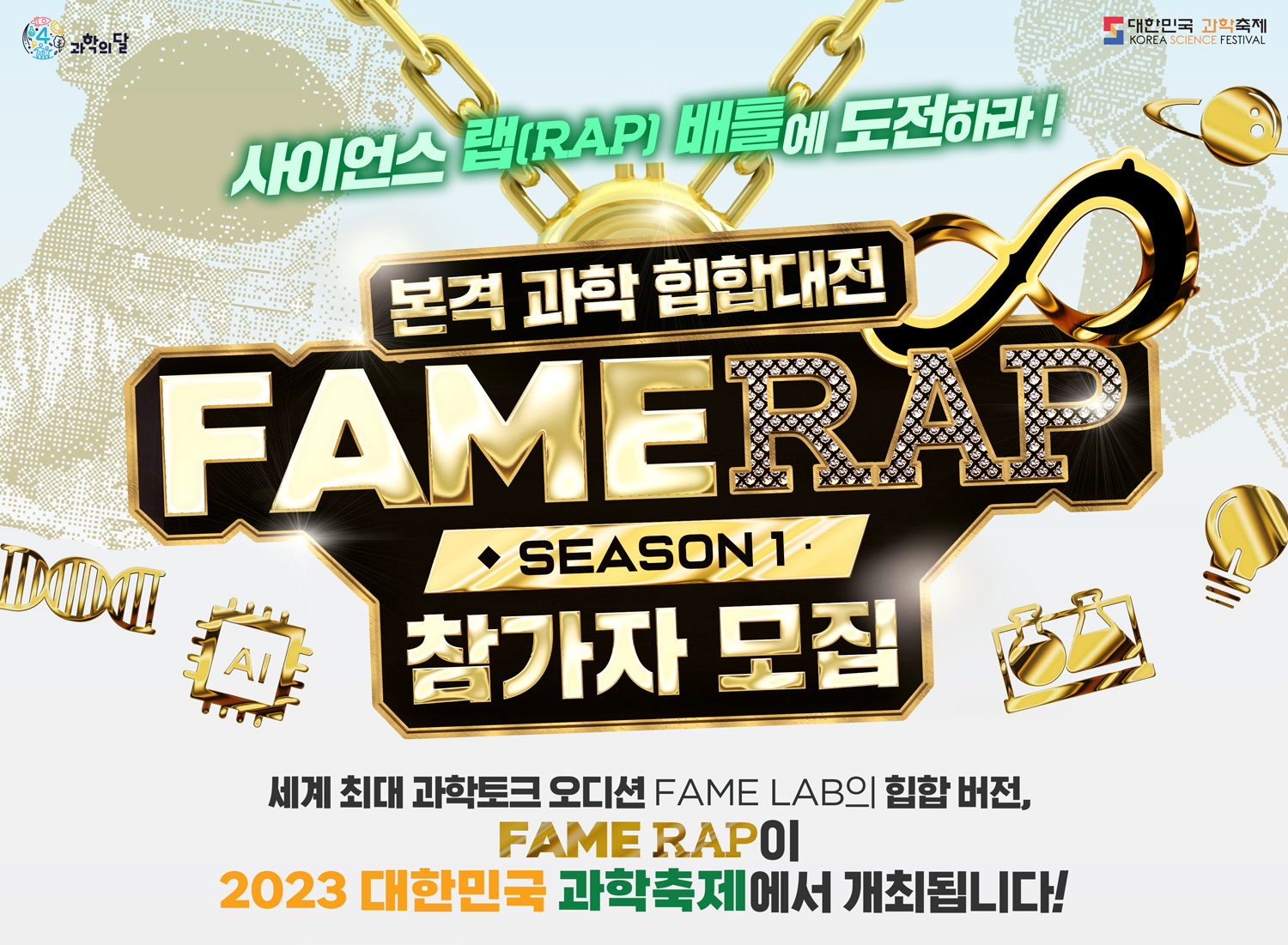 2023 대한민국 과학축제에서 과학 래퍼 발굴 오디션 ‘페임랩(Fame RAP) 시즌1’이 개최된다. 페임랩(Fame RAP)은 세계 최대 과학 토크 오디션 ‘페임랩(Fame Lab)’의 힙합 버전 대회로 과학을 소재로 한 다양한 주제의 창작 랩 지원을 받고 있다.