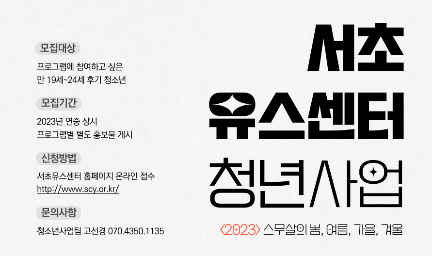 서초유스센터(이하 센터)는 지역 청소년 및 청년들이 안정적이고 단계적으로 성장할 수 있도록 대학생 대외 활동 동아리, 청년 아카데미, 청년 재테크 특강, 미디어아트 전문 프로젝션 매핑 프로그램 등 ‘청년을 위한’ 사업을 추진한다.